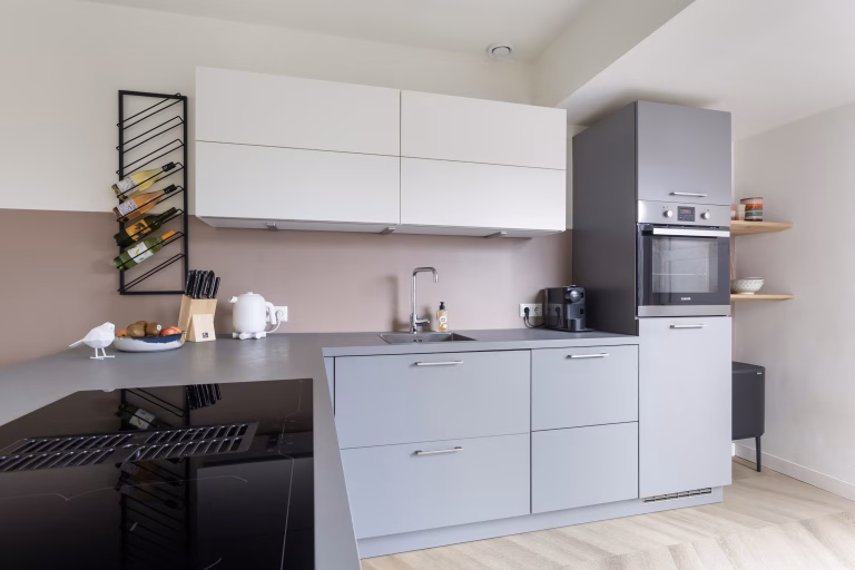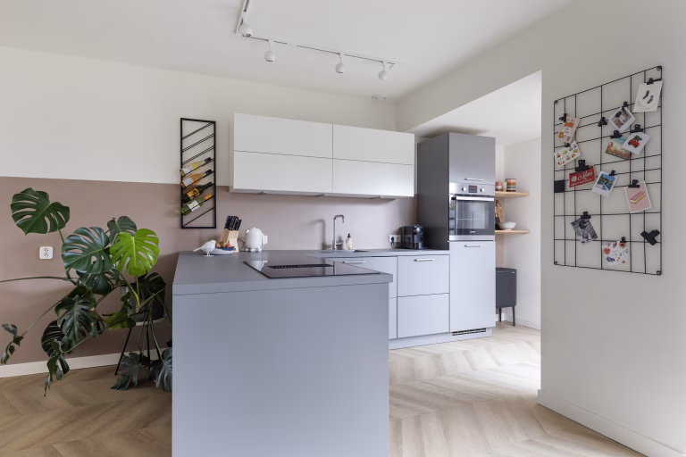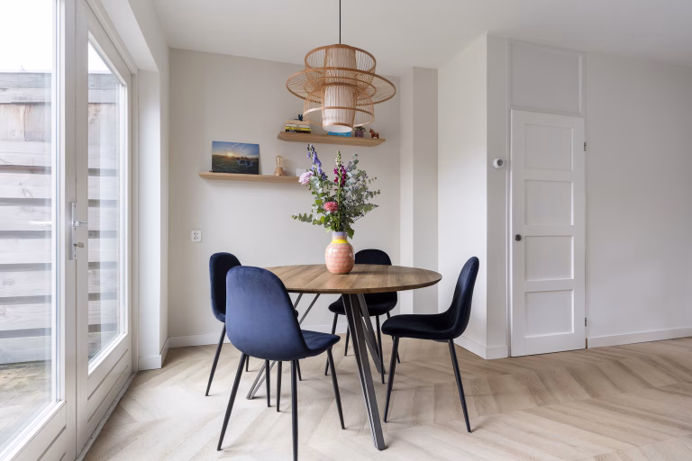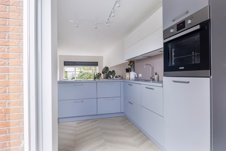 Op de begane grond vind je de sfeervolle woonkamer (in 2021 geheel verbouwd) met grote ramen en een prettige lichtinval. De benedenverdieping is voorzien van vloerverwarming en een stijlvolle Hongaarse punt PVC-vloer, wat zorgt voor een warme en moderne uitstraling. De open indeling biedt ruimte voor zowel een zithoek als een gezellige eethoek. De hoekkeuken is modern uitgevoerd en uitgerust met een inductiekookplaat met interne afzuiging, vaatwasser, oven en koelkast. Alles binnen handbereik voor wie graag kookt en geniet van een strakke, praktische inrichting. Achter de keuken bevindt zich nog een praktische stenen bijkeuken waar plek is voor de witgoedopstelling.