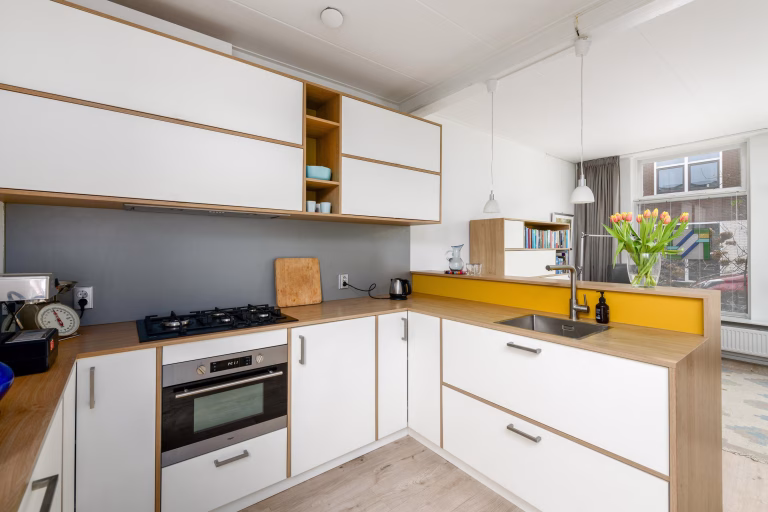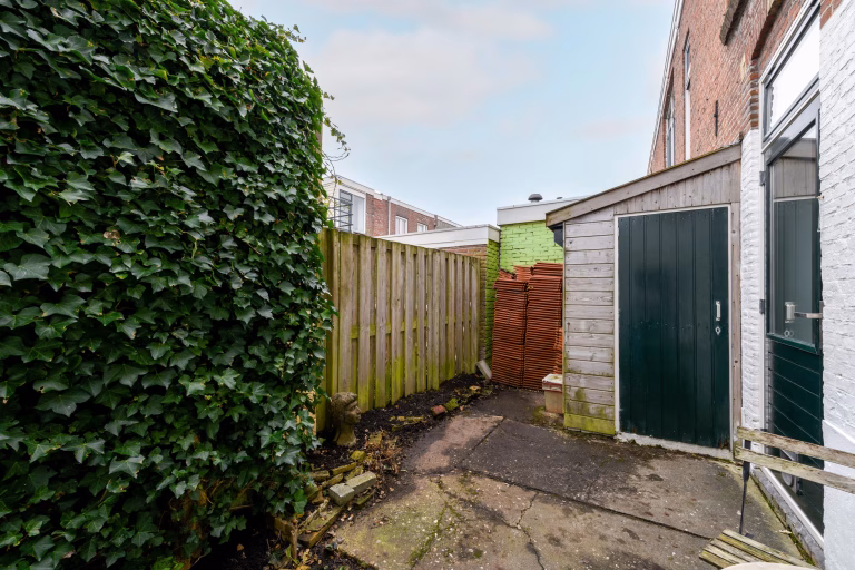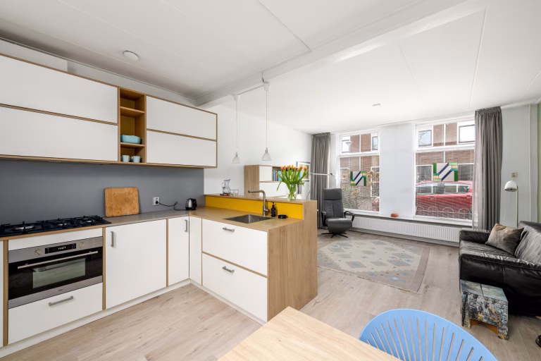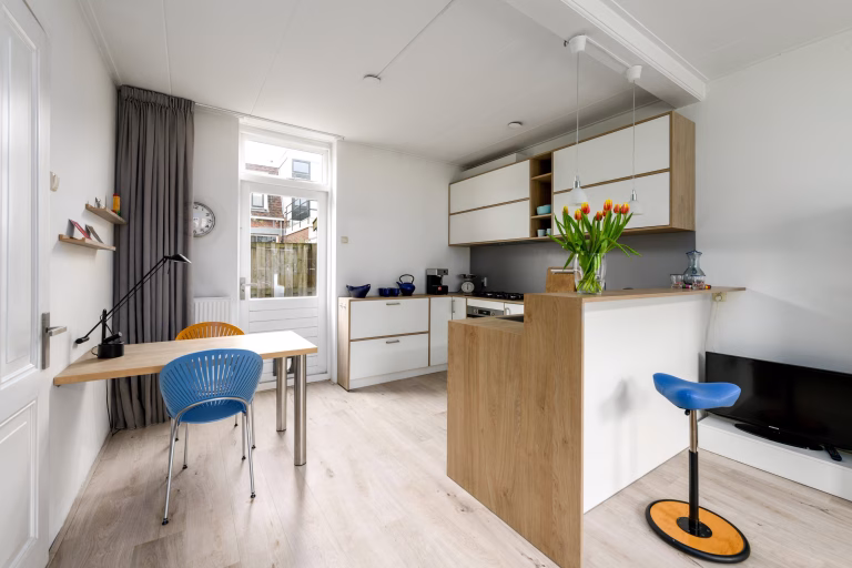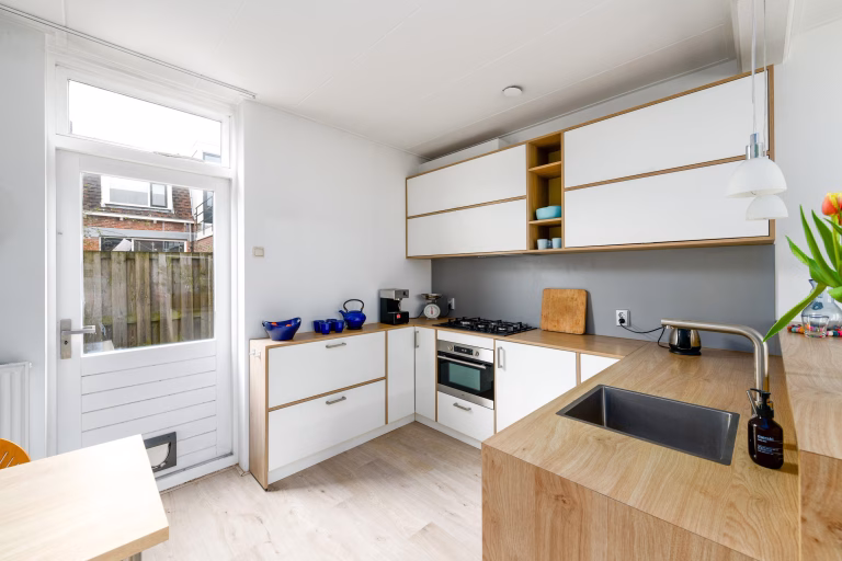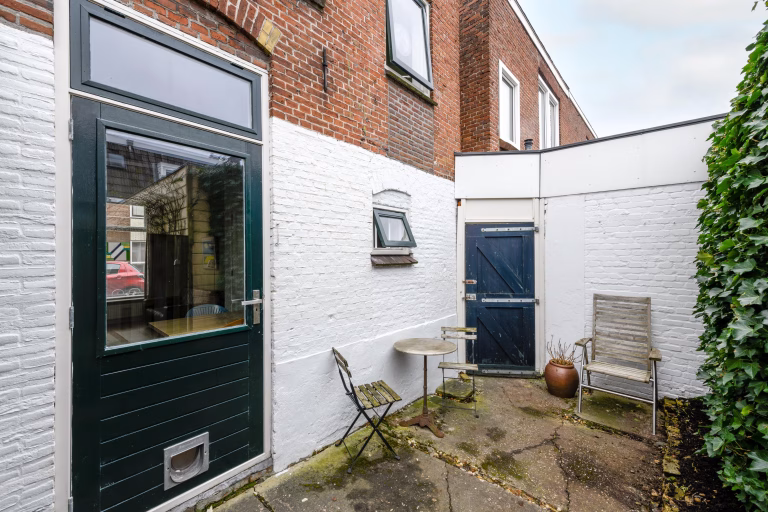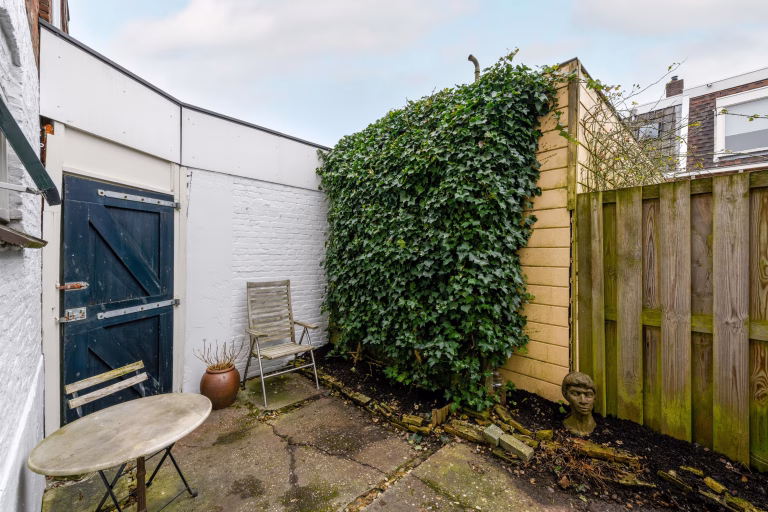 De royale, op maat gemaakte keuken is uitgerust met een oven, 5-pits gasfornuis met afzuigkap en een koelkast. Rustig een kopje koffie drinken in de ochtend in het zonnetje? Achter de woning bevindt zich een gezellige stadstuin met berging en via de steeg naast de woning kun je met de fiets achterom komen.