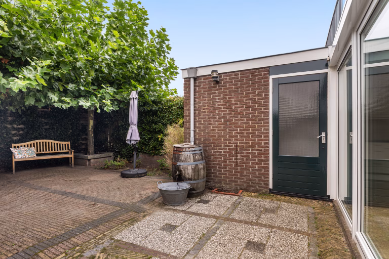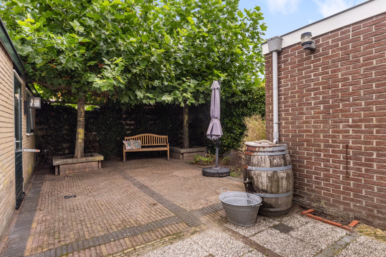 De tuin ligt op het noorden en biedt veel privacy. Door de diepte van ruim acht meter is er ruimte voor een mooie loungeset en blijft er voldoende plek over voor bijvoorbeeld kinderen om te spelen. De garage staat los van de woning en is via de tuin bereikbaar, ideaal voor opslag of als extra klusruimte.