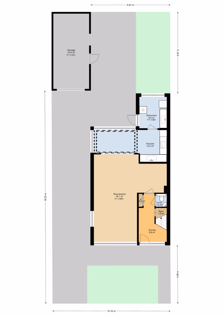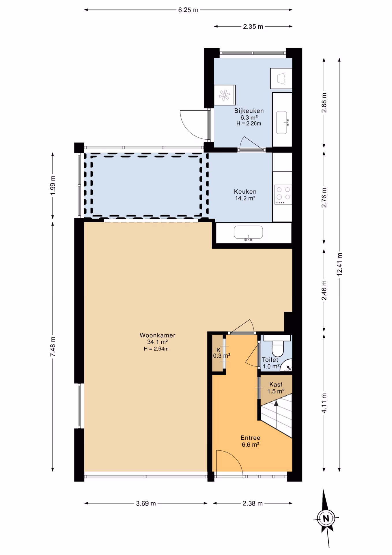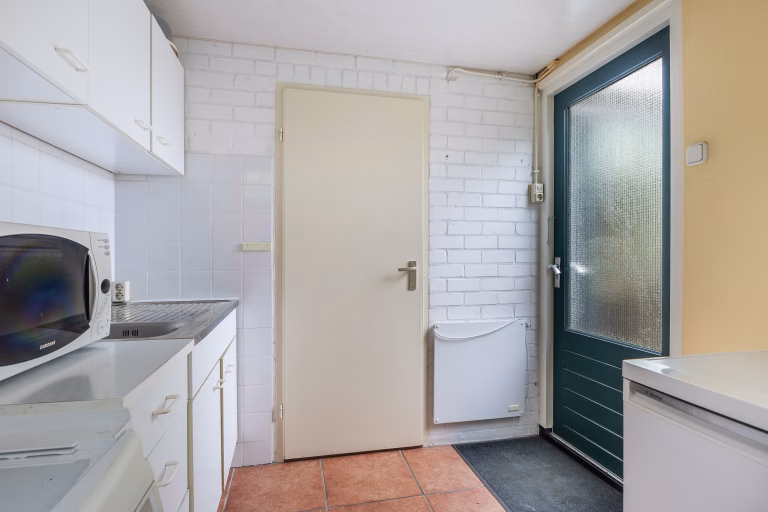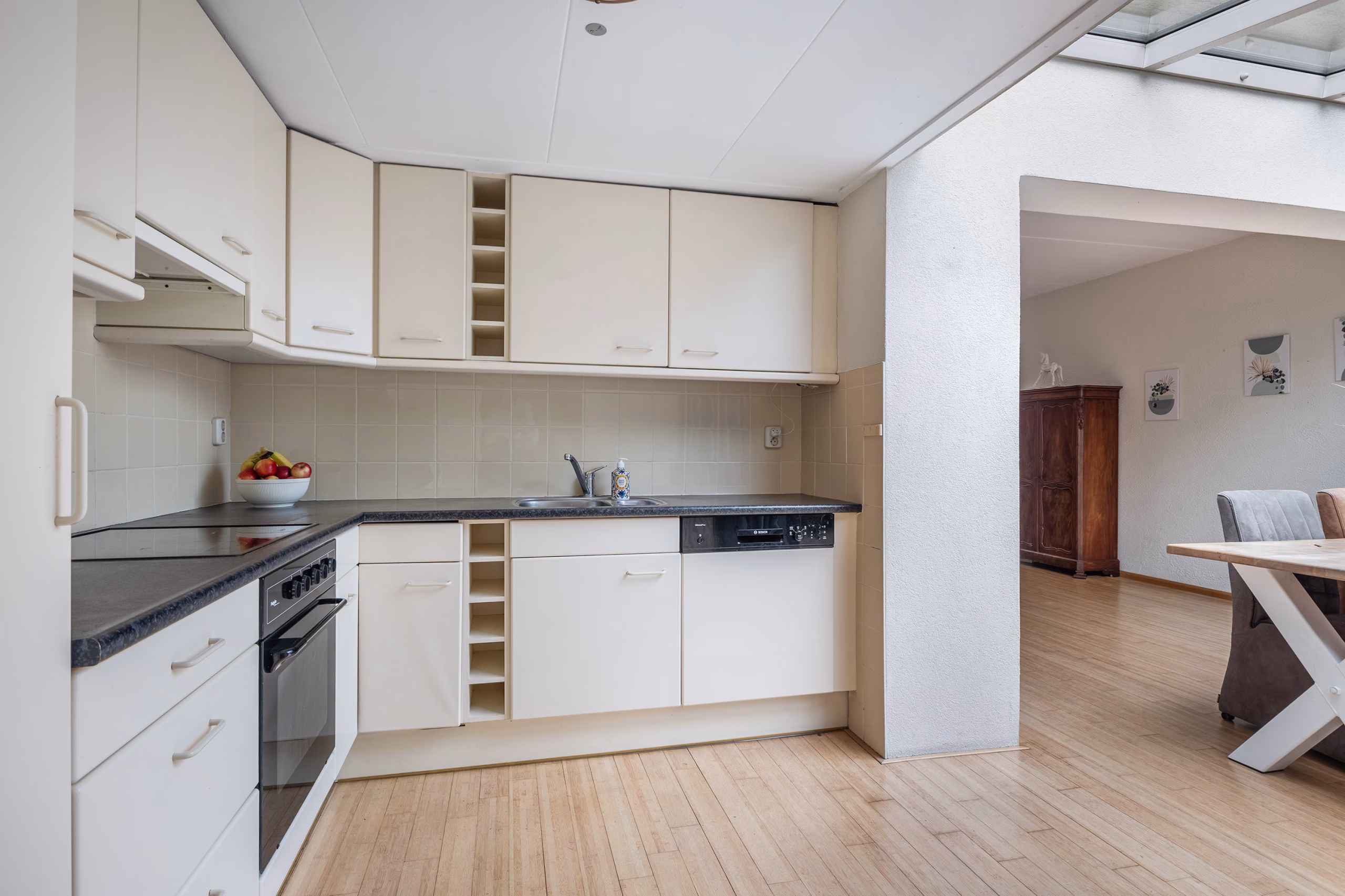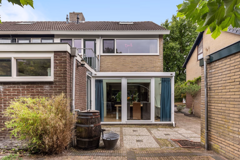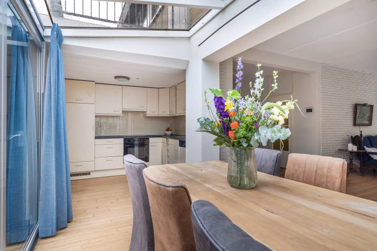 We nemen je graag mee door de woning. Bij binnenkomst kom je in de hal met toegang tot het toilet, de trapopgang en de woonkamer. De woonkamer is licht en ruim en heeft aan de voorzijde een fijne zithoek. Aan de achterzijde bevindt zich het uitgebouwde eetgedeelte, dat door de grote ramen en de schuifpui prachtig in verbinding staat met de tuin. De keuken grenst direct aan dit eetgedeelte en vormt samen met de woonkamer één geheel. Vanuit de keuken loop je door naar de praktische bijkeuken, die extra bergruimte en toegang tot de tuin biedt.