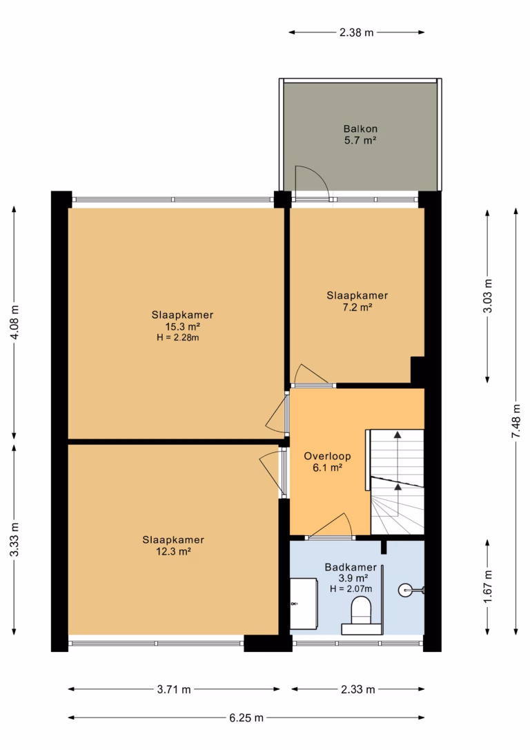 Op de eerste verdieping zijn drie slaapkamers van goed formaat en een nette badkamer met douche, wastafel en toilet.